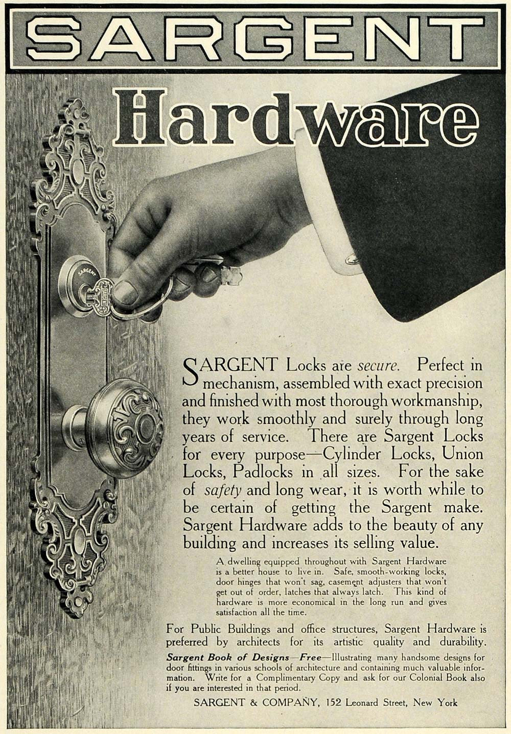 This is an original 1911 black and white print ad for Sargent Hardware, specially featuring their line of Cylinder Locks, Union Locks and Padlocks.