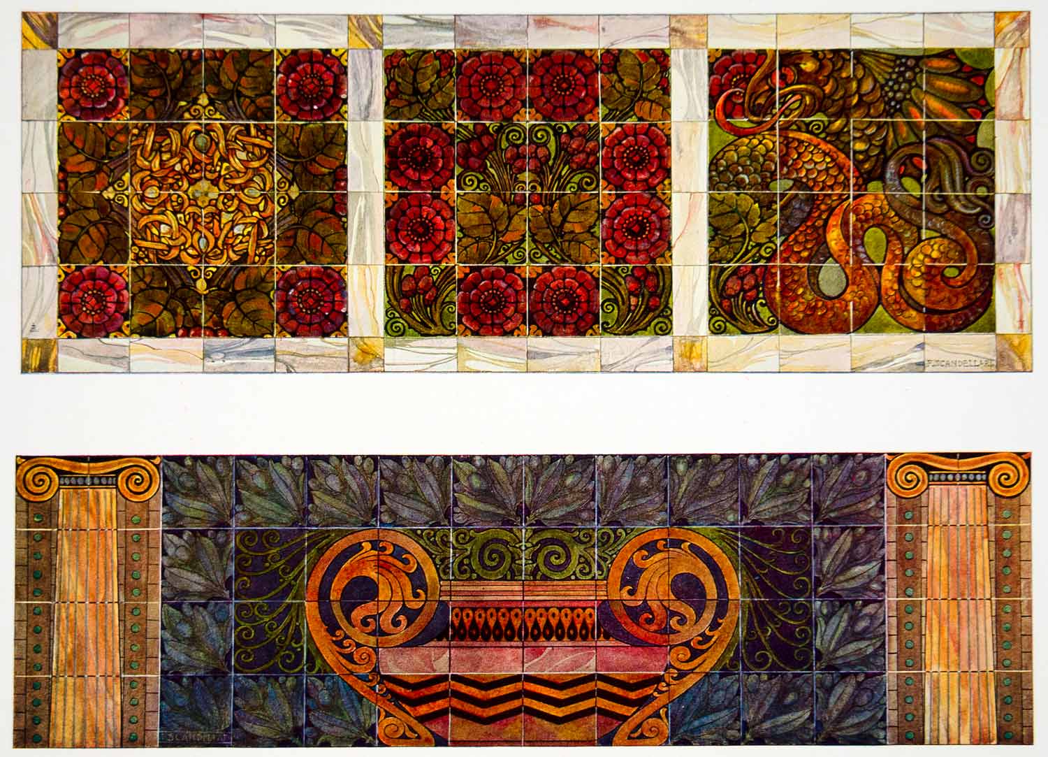 This is an original 1917 color photolithograph of Art Nouveau decorative ceramic tile designs by Ferruccio Scandellari.