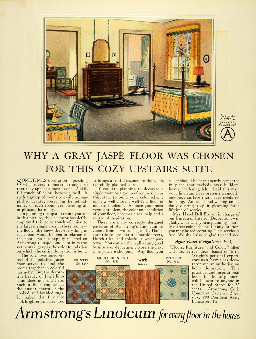 This is an original 1925 color print ad for Armstrong’s Linoleum, featured in a variety of patterns including, Jaspe, Printed and Moulded Inlaid.