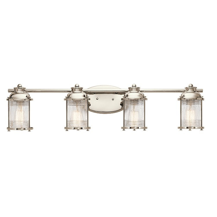 Ashland Bay offers a nautical feel with this four-light bathroom vanity fixture. For a vintage inspired look, Polished Nickel accentuates the beautiful clear seeded glass. To complete the look, optional vintage-style bulbs shine brightly through. For an added ambiance, nothing compares to Ashland Bay.