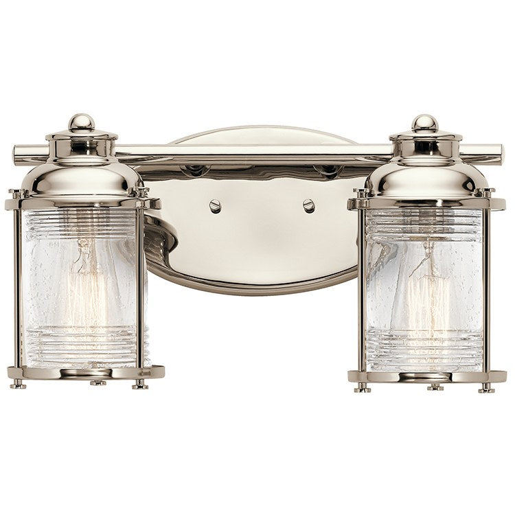 Ashland Bay offers a nautical feel with this two-light bathroom vanity fixture. For a vintage inspired look, Polished Nickel accentuates the beautiful clear seeded glass. To complete the look, optional vintage-style bulbs shine brightly through. For an added ambiance, nothing compares to Ashland Bay.